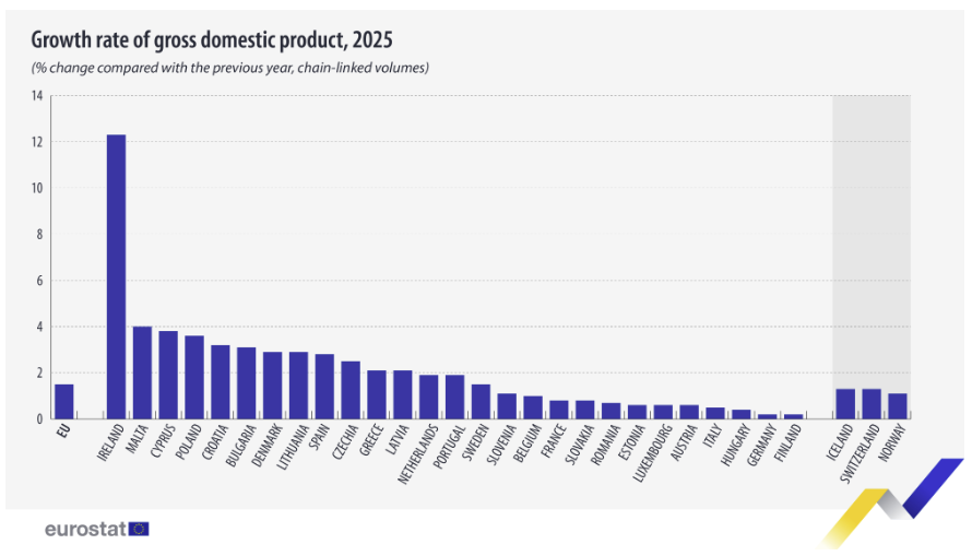 Σε σύγκριση με το 2024, το ΑΕΠ αυξήθηκε σε όλες τις χώρες της ΕΕ το 2025, με τις υψηλότερες αυξήσεις να καταγράφονται στην Ιρλανδία (+12,3%), τη Μάλτα (+4,0%) και την Κύπρο (+3,8%).