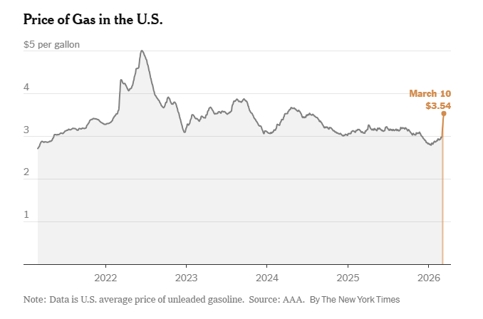 Οπως σημειώνουν οι New York Times, πρόκειται για αύξηση 19% από τότε που οι Ηνωμένες Πολιτείες και το Ισραήλ επιτέθηκαν στο Ιράν, πυροδοτώντας μια περιφερειακή σύγκρουση που έχει πλήξει την παραγωγή, την αποθήκευση και τη μεταφορά πετρελαίου από τον Περσικό Κόλπο προς τον υπόλοιπο κόσμο.