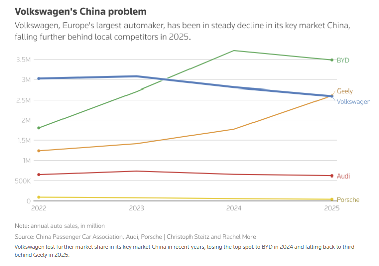Όπως και οι ανταγωνιστές της, η Volkswagen είναι αντιμέτωπη με πιέσεις σε όλες τις μεγάλες αγορές, με τους αμερικανικούς δασμούς να κοστίζουν στην εταιρεία δισεκατομμύρια και τον τοπικό ανταγωνισμό να υπονομεύει το μερίδιό της στην Κίνα, τη μεγαλύτερη αγορά αυτοκινήτων στον κόσμο.