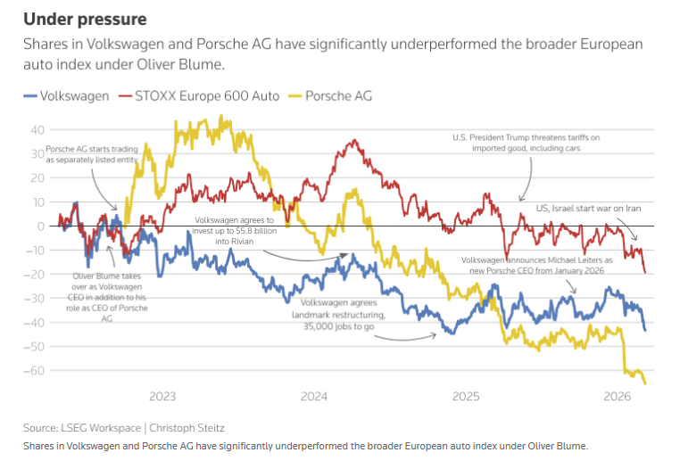 Αυτό περιλαμβάνει ένα πακέτο αναδιάρθρωσης στην Porsche, της οποίας τα λειτουργικά κέρδη εξαφανίστηκαν σχεδόν εξ ολοκλήρου το 2025, μειωμένα κατά 98% στα 90 εκατομμύρια ευρώ.