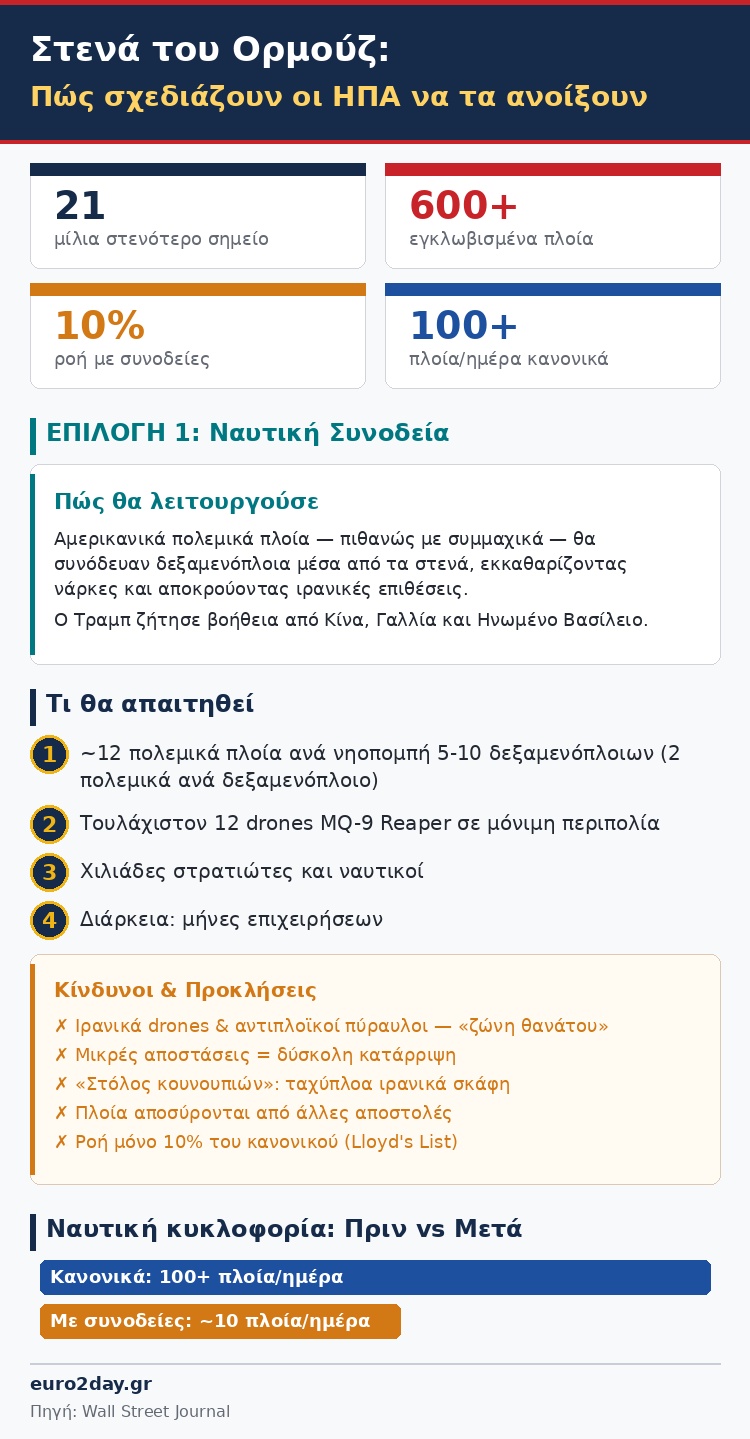 Σε μια επιχείρηση συνοδείας, αμερικανικά πολεμικά πλοία — πιθανώς σε συνεργασία με συμμαχικά ναυτικά — θα διέρχονταν από τα στενά δίπλα σε δεξαμενόπλοια πετρελαίου για την εκκαθάριση ναρκών και την απόκρουση ιρανικών επιθέσεων από αέρος καθώς και από τον λεγόμενο «στόλο κουνουπιών» του Ιράν, δηλαδή μικρά και ταχύπλοα σκάφη ταχείας επίθεσης.