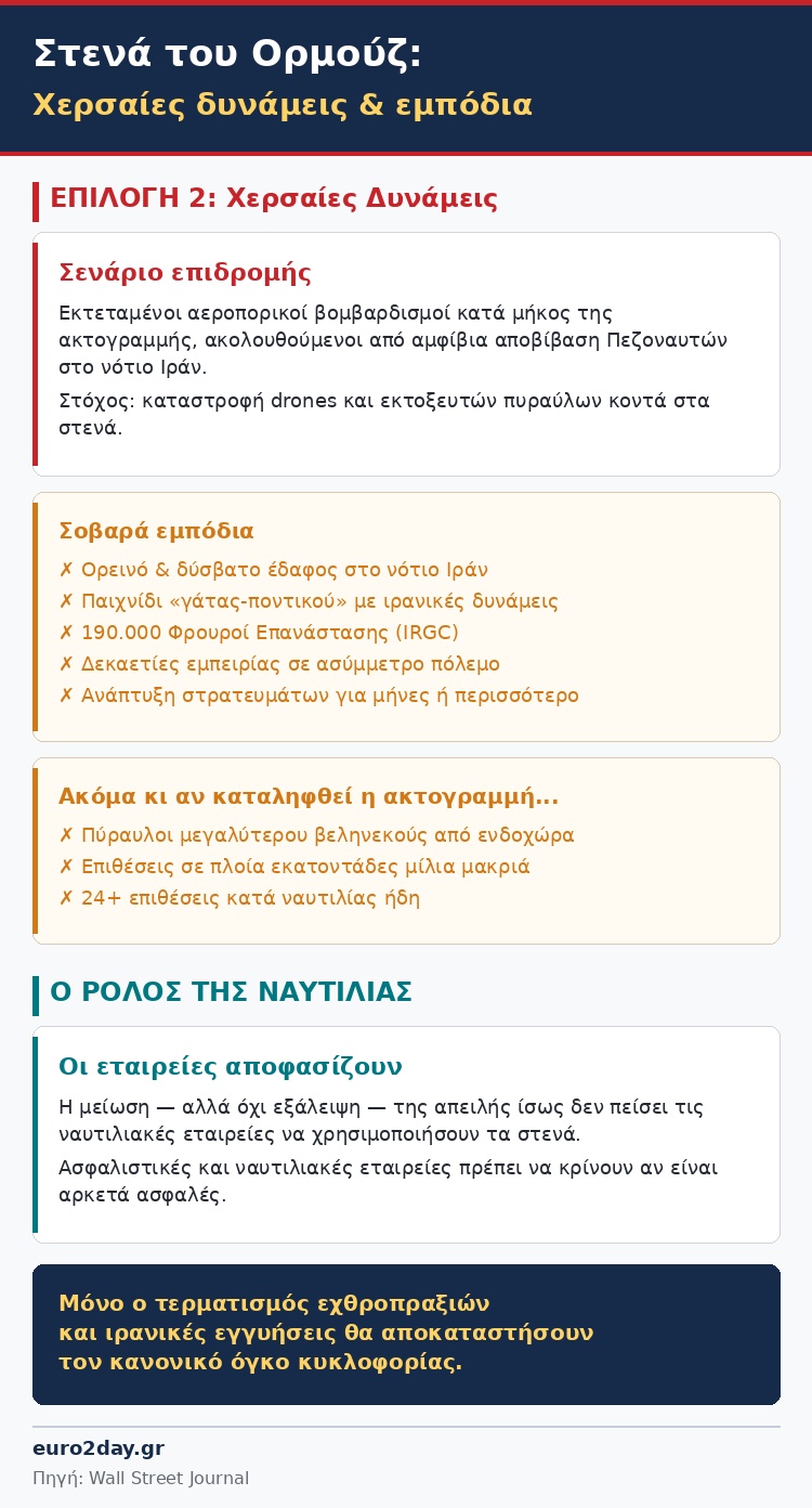 Οι ΗΠΑ αποφεύγουν προς το παρόν να στείλουν πολεμικά πλοία μέσα στα στενά — τα οποία έχουν πλάτος μόλις 21 μίλια στο στενότερο σημείο τους — με αξιωματικούς του Ναυτικού να προειδοποιούν ότι ιρανικά drones και αντιπλοϊκοί πύραυλοι θα μπορούσαν να μετατρέψουν την περιοχή σε «ζώνη θανάτου» για τους Αμερικανούς ναυτικούς.