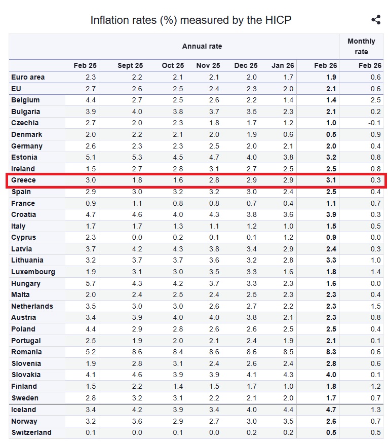 Στο ετήσιο 3,1% αναθεωρεί οριακά υψηλότερα τον πληθωρισμό στη χώρα μας τον Φεβρουάριο, η Eurostat. Η πρώτη εκτίμησή της έκανε λόγο για 3,0%. Εναν μήνα πριν ήταν στο 2,9%.