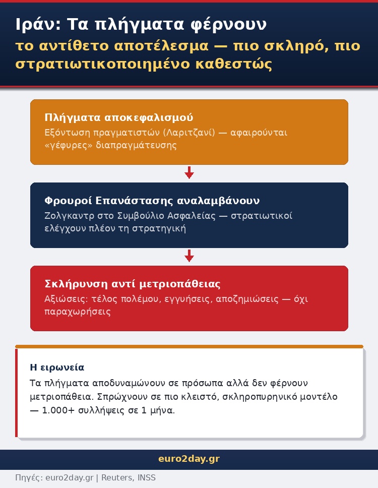 Τα πλήγματα αποκεφαλισμού αποδυναμώνουν το Ιράν σε πρόσωπα, εμπειρία και δυνατότητα συντονισμού. Δεν φαίνεται όμως, τουλάχιστον προς το παρόν, να το ωθούν προς πολιτική μετριοπάθεια.