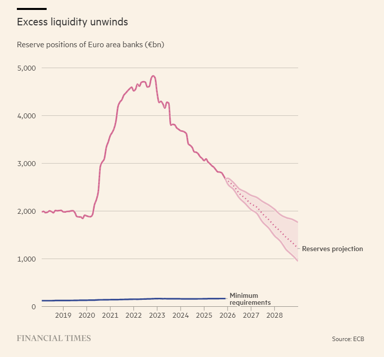 Ως αποτέλεσμα, η πλεονάζουσα ρευστότητα που τοποθετούν οι τράπεζες στην ΕΚΤ έχει ήδη μειωθεί σχεδόν κατά 50% και αναμένεται να συρρικνωθεί περαιτέρω έως το 2027.