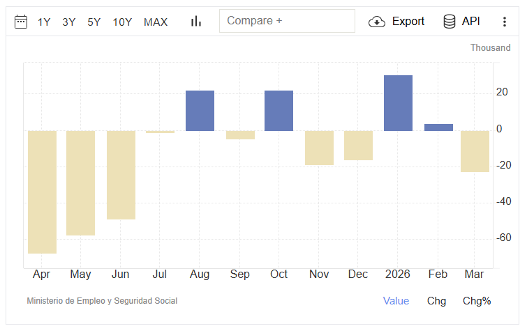 Ο αριθμός των εγγεγραμμένων ανέργων στην Ισπανία μειώθηκε κατά 22.934 άτομα σε σχέση με τον προηγούμενο μήνα, φτάνοντας τα 2,420 εκατομμύρια τον Μάρτιο, σε αντίθεση με τις προσδοκίες της αγοράς που προέβλεπαν αύξηση κατά 10.300 άτομα.