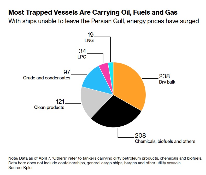 Τα πλοία που μεταφέρουν ενέργεια αποτελούν μεγάλο μέρος του στόλου που έχει εγκλωβιστεί εντός του Κόλπου, σύμφωνα με στοιχεία της Kpler. Υπάρχουν επί του παρόντος 426 δεξαμενόπλοια που μεταφέρουν αργό πετρέλαιο και καθαρά καύσιμα, καθώς και 34 πλοία μεταφοράς υγροποιημένου πετρελαϊκού αερίου και 19 πλοία μεταφοράς υγροποιημένου φυσικού αερίου. Τα υπόλοιπα μεταφέρουν ξηρά φορτία, όπως αγροτικά ή μεταλλικά προϊόντα, ή εμπορευματοκιβώτια.