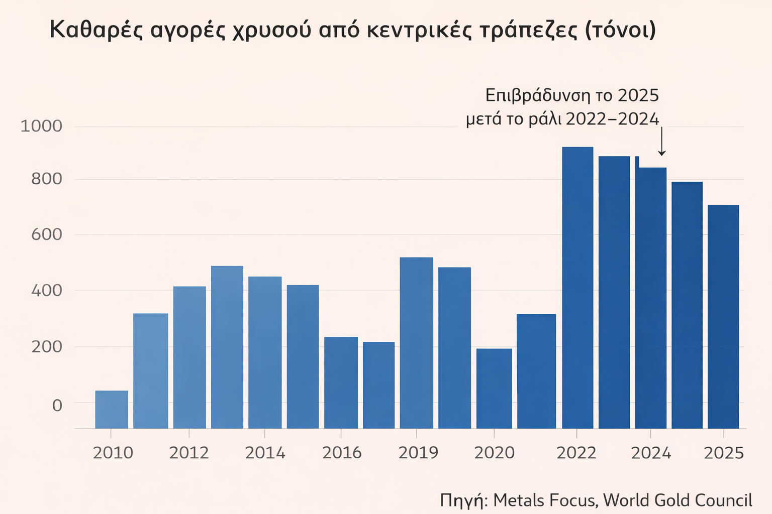 Τα στοιχεία του World Gold Council καταγράφουν μείωση 20% στις καθαρές αγορές χρυσού από κεντρικές τράπεζες το 2024, στις 860 τόνους, επιβεβαιώνοντας τη σταδιακή μεταστροφή.