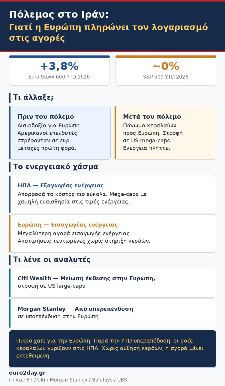 Ο πόλεμος στο Ιράν, ωστόσο, ανέτρεψε πλήρως αυτή την εικόνα. Καθώς οι διαχειριστές κεφαλαίων προσπαθούν να αναδιαμορφώσουν τα χαρτοφυλάκιά τους για να αντιμετωπίσουν τη νέα οικονομική πραγματικότητα που έχει διαμορφωθεί από την έναρξη της σύγκρουσης, πολλοί καταλήγουν στο συμπέρασμα ότι πρέπει να παγώσουν αυτή τη «ρομαντική» σχέση με την Ευρώπη.