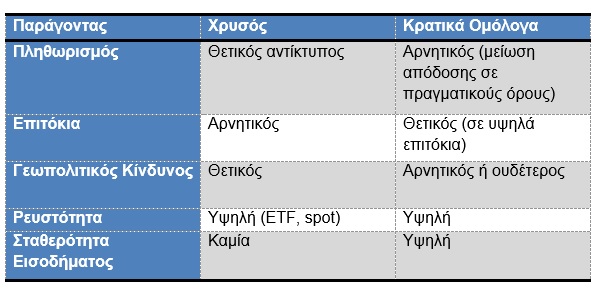 Η ελκυστικότητα του χρυσού ενισχύεται ιστορικά σε περιβάλλοντα υψηλής αβεβαιότητας, πληθωρισμού ή υποτίμησης νομισμάτων. Αντίθετα, τα κρατικά ομόλογα βασίζονται στην αξιοπιστία του εκδότη και τη σταθερότητα των επιτοκίων.
