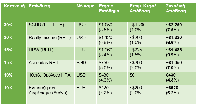 Το χαρτοφυλάκιο των $100.000 αποδίδει συνολικά περίπου $7.975 ετησίως, ή περίπου 8% συνολική απόδοση χωρίς επανεπένδυση. Αυτό περιλαμβάνει εισόδημα από μερίσματα, τόκους και ενοίκια, μαζί με εκτιμώμενη κεφαλαιακή ανάπτυξη.