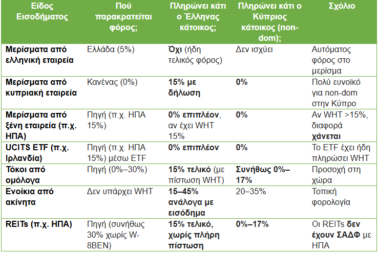 Ο συνολικός φόρος στα μερίσματα στην Ελλάδα είναι 15%, ανεξαρτήτως προέλευσης. Αν έχει παρακρατηθεί φόρος στο εξωτερικό, συμψηφίζεται με τον ελληνικό φόρο. Στην Κύπρο, οι μη-domiciled φορολογικοί κάτοικοι δεν φορολογούνται σε μερίσματα και τόκους, κάτι που είναι πλεονέκτημα για διεθνείς επενδυτές. Η παρακράτηση φόρου (WHT) στο εξωτερικό δεν σημαίνει απαλλαγή από φορολογία· πρέπει να δηλωθεί για να αποφύγεις τη διπλή φορολόγηση ή να λάβεις πίστωση φόρου.