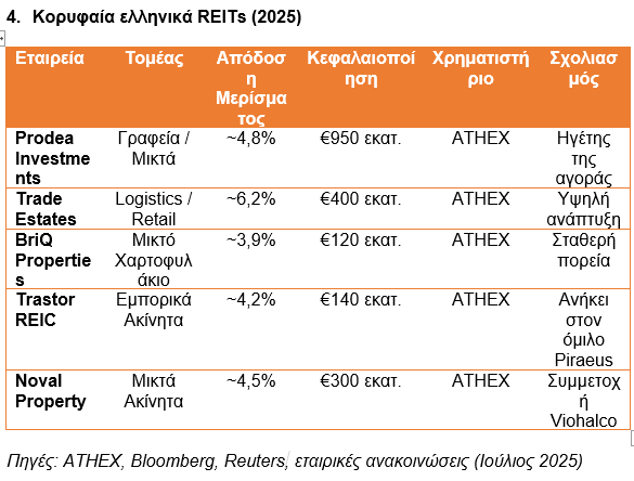 • Ελληνικα REITs (ΑΕΕΑΠ): Εταιρείες όπως οι Prodea, Trade Estates, BriQ, Trastor και Noval προσφέρουν πρόσβαση σε χαρτοφυλάκια με γραφεία, logistics, τουριστικά και εμπορικά ακίνητα. Τα συνολικά υπό διαχείριση κεφάλαια (AUM) ξεπέρασαν τα €3,5 δισ. στα μέσα του 2025.