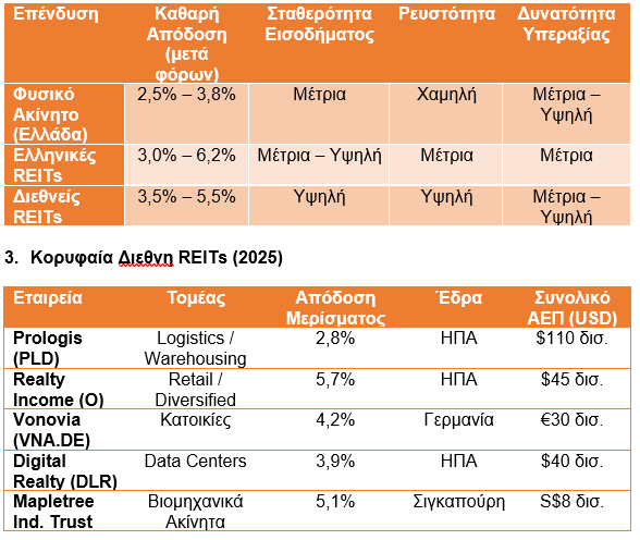 • Διεθνείς REITs για γεωγραφική και τομεακή διαφοροποίηση.