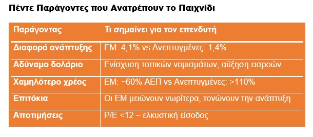 Η κατανομή κεφαλαίων σε EM εξαρτάται από το επενδυτικό προφίλ, τον χρονικό ορίζοντα και την ανοχή στον κίνδυνο. Ωστόσο, η στρατηγική ενσωμάτωσή τους σε ένα διαφοροποιημένο χαρτοφυλάκιο θεωρείται πλέον απαραίτητη.