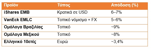 Οι αποδόσεις στα EM ομόλογα παραμένουν ισχυρές – συχνά διπλάσιες από τα αμερικανικά Treasuries. Η επιλογή μεταξύ κρατικών ομολόγων σε δολάρια και τοπικών νομισμάτων εξαρτάται από την ανοχή στον νομισματικό κίνδυνο.