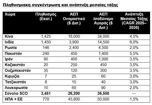 Σημείωση: Οι χώρες-εταίροι διαλόγου, όπως η Τουρκία (ΑΕΠ ~1,1 τρισ. δολάρια, πληθυσμός ~85 εκατ.), διευρύνουν την οικονομική επιρροή του ΟΣΣ (Οργάνωση Συνεργασίας της Σαγκάης) πέρα από την Ευρασία.