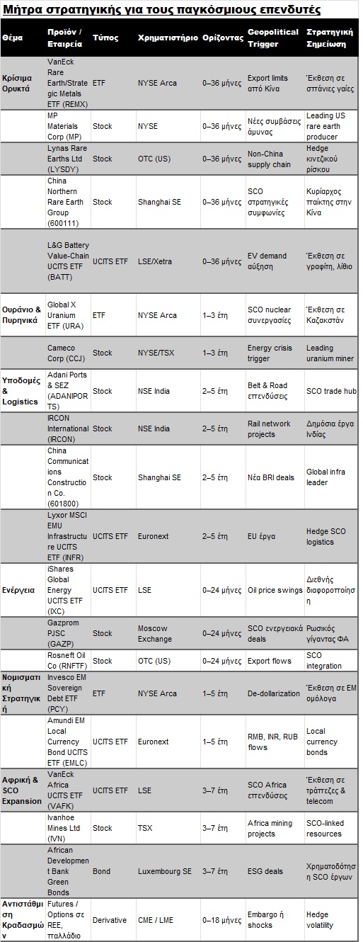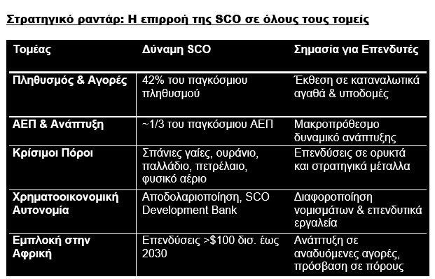 Επενδυτική Συμβουλή: Διαφοροποιήστε σε SCO-linked assets, αντισταθμίστε γεωπολιτικούς κινδύνους και τοποθετηθείτε για μακροπρόθεσμη ανάπτυξη σε Ευρασία και Αφρική.