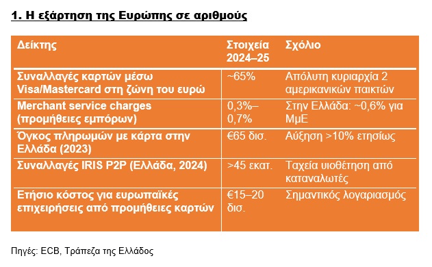 Για δεκαετίες, η ευρωπαϊκή αρχιτεκτονική πληρωμών εξαρτάται από δύο αμερικανικούς παρόχους – Visa και Mastercard – με συνέπειες σε κόστος, ανταγωνιστικότητα και στρατηγική αυτονομία. Σχεδόν τα δύο τρίτα των συναλλαγών με κάρτα περνούν μέσα από τα δίκτυά τους, ενώ οι προμήθειες κοστίζουν δισεκατομμύρια ευρώ ετησίως σε επιχειρήσεις και καταναλωτές.