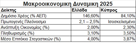 Η Ελλάδα συνεχίζει τη δημοσιονομική της εξυγίανση, με σταθερή μείωση του χρέους και βελτίωση της πιστοληπτικής της ικανότητας. Η Κύπρος, από την πλευρά της, εδραιώνει ένα ευέλικτο φορολογικό και τραπεζικό πλαίσιο, που στηρίζει την ανάπτυξη και προσφέρει θεσμική προβλεψιμότητα.