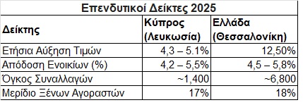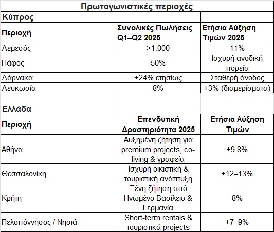 Η Κύπρος σημείωσε αύξηση 15% στις πωλήσεις ακινήτων το πρώτο εξάμηνο του 2025 (1.664 πωλήσεις τον Μάιο — ρεκόρ 17 ετών). Η Ελλάδα, με αιχμή τη Θεσσαλονίκη και την Αθήνα, κατέγραψε ετήσια αύξηση τιμών 12–13%, με έντονο ενδιαφέρον σε αστικές και παραθαλάσσιες περιοχές.