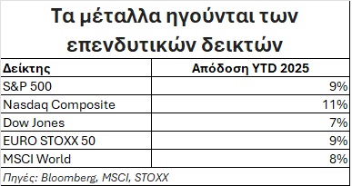 Οι μετοχικές αγορές κινούνται θετικά, αλλά με περιορισμένο εύρος. Αντίθετα, τα μέταλλα υπερδιπλασίασαν τις αποδόσεις τους. Η στροφή κεφαλαίων προς «σκληρά» περιουσιακά στοιχεία αποτυπώνει την ανάγκη για σταθερότητα και πραγματική αξία σε ένα περιβάλλον νομισματικής κόπωσης.