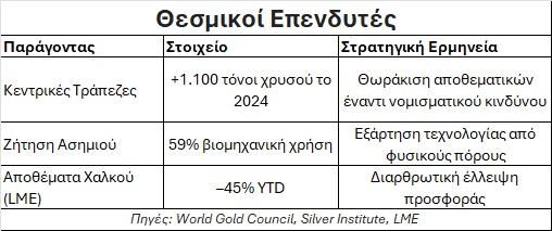 Πηγές: Trading Economics · Kitco Metals · Bloomberg Metals Desk · World Gold Council · Silver Institute · London Metal Exchange · MSCI · STOXX