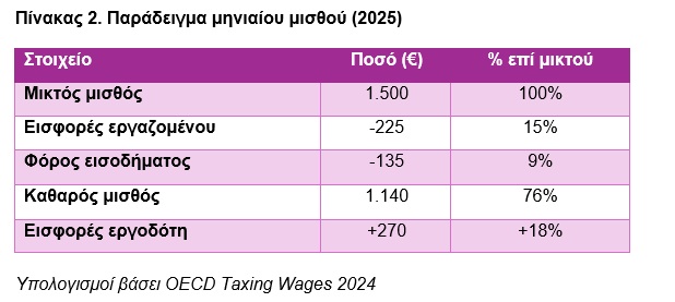 Η ψαλίδα μεταξύ μικτών και καθαρών αποδοχών είναι από τις υψηλότερες στην Ευρώπη: σχεδόν το 24% του εισοδήματος εξαφανίζεται σε φόρους και εισφορές πριν φτάσει στον εργαζόμενο.