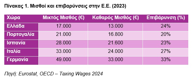 Πηγές: Eurostat (2023, 2024), OECD Taxing Wages (2024), ΕΛΣΤΑΤ, Υπουργείο Οικονομικών, IMF Country Report Greece 2024
