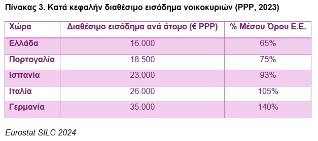 Το διαθέσιμο εισόδημα μετρά όλα τα μέλη των νοικοκυριών μετά από φόρους και επιδοτήσεις (μισθοί, συντάξεις, κοινωνικά επιδόματα). Περιλαμβάνει και όσους δεν εργάζονται ή εργάζονται μερικώς. Η Ελλάδα παραμένει χαμηλά, ενώ η Γερμανία είναι ψηλά χάρη σε μισθούς και επιδόματα. Το παράδοξο: οι πολίτες φορολογούνται σαν πλούσιοι, αλλά αμείβονται σαν φτωχοί.