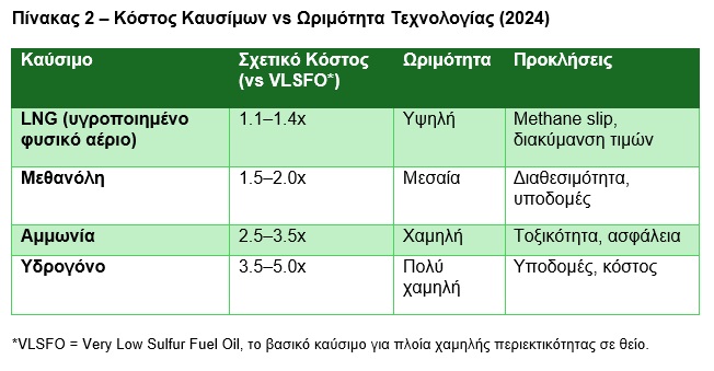 Ταυτόχρονα, νέες τεχνολογίες, όπως LNG (υγροποιημένο φυσικό αέριο), μεθανόλη, αμμωνία, υδρογόνο και άλλα υβριδικά συστήματα, αυξάνουν το τεχνολογικό και χρηματοδοτικό ρίσκο. Η Ελλάδα, με τον μεγαλύτερο στόλο παγκοσμίως (~21% της παγκόσμιας χωρητικότητας σε Deadweight Tonnage – DWT), έχει την ευκαιρία αλλά ίσως και την πρόκληση να ηγηθεί αυτής της μετάβασης.
