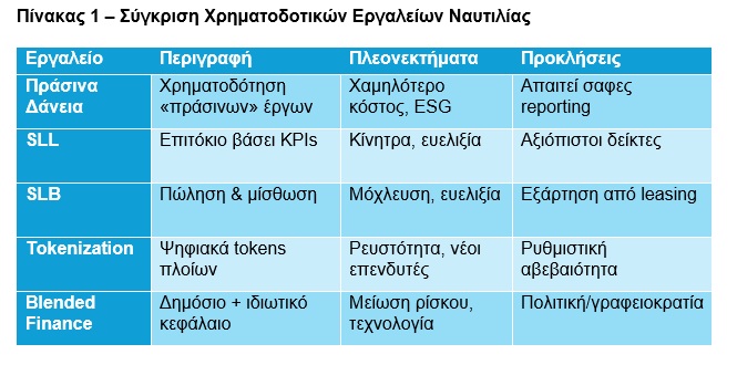 Το Blended Finance συνδυάζει κεφάλαια διεθνών οργανισμών (π.χ. EIB, EBRD, IFC), κρατικά κονδύλια και ιδιώτες επενδυτές. Χρηματοδοτεί projects υψηλού ρίσκου, όπως ammonia-ready πλοία, green corridors και υποδομές λιμένων. Η Ελλάδα, στρατηγικά στη Μεσόγειο, θα μπορούσε να γίνει κόμβος τέτοιων συνεργασιών.