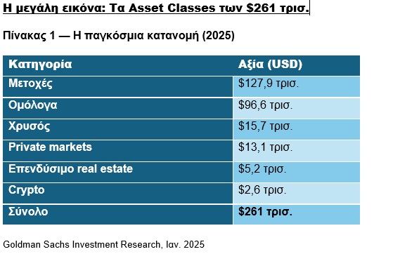 Σύμφωνα με τη Goldman Sachs Investment Research $261 τρισ. αποτελούν το παγκόσμιο επενδυτικό σύμπαν. Στο σημερινό μας άρθρο, θα χρησιμοποιήσουμε αυτό το στοιχείο όχι μόνο σαν ένα αριθμό που εντυπωσιάζει, αλλά σαν ένα νούμερο που ταυτόχρονα εξηγεί και καθοδηγεί.