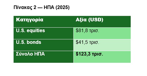 Οι μετοχές είναι σχεδόν το μισό σύμπαν. Τα ομόλογα είναι το ένα τρίτο. Τα υπόλοιπα συμπληρώνουν την εικόνα. Αλλά το πραγματικό ερώτημα δεν είναι «τι υπάρχει». Είναι πού βρίσκεται η συγκέντρωση.