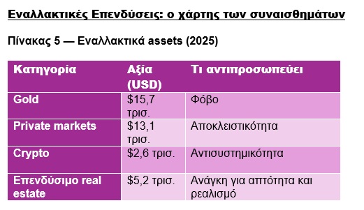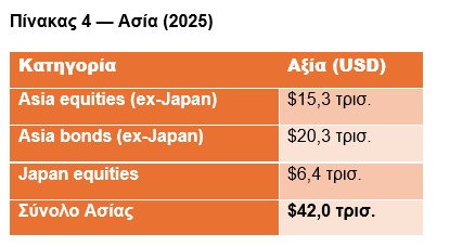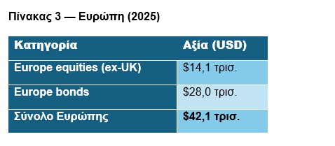 Αυτό σημαίνει ότι το μεγαλύτερο asset class στον κόσμο -το παγκόσμιο real estate με αξία άνω των $300 τρισ. (BIS Real Estate Indicators 2024–2025)- βρίσκεται εκτός του σημερινού μας άρθρου. Ο επενδυτής, λοιπόν, κινείται σε ένα σύμπαν που είναι πολύ μικρότερο από τον πραγματικό πλούτο του πλανήτη.