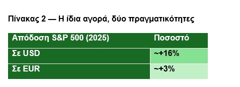 Το FX δεν ήταν ο μόνος παράγοντας, αλλά ήταν καθοριστικός. Σε μια χρονιά με στενή άνοδο, το νόμισμα έκανε τη διαφορά ανάμεσα σε κέρδη και στασιμότητα.