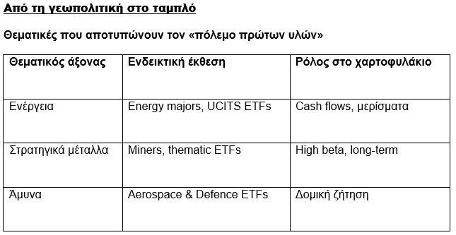Σε έναν κόσμο όπου οι συγκρούσεις αφορούν βαρέλια, τόνους μετάλλων και αλυσίδες εφοδιασμού, τα χαρτοφυλάκια που αγνοούν αυτή την πραγματικότητα είναι δομικά εκτεθειμένα. Αντίθετα, μια ψύχραιμη, ισορροπημένη έκθεση σε ενέργεια, στρατηγικά μέταλλα και άμυνα δεν είναι επιθετικό στοίχημα· είναι προσαρμογή στη νέα παγκόσμια τάξη.