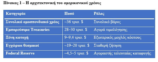 Το αμερικανικό δημόσιο χρέος λειτουργεί ως παγκόσμιο κοινό αγαθό. Το συνολικό ομοσπονδιακό χρέος προσεγγίζει τα 36 τρισ. δολάρια, όμως η πραγματική αγορά είναι τα 28–30 τρισ. δολάρια εμπορεύσιμων τίτλων.