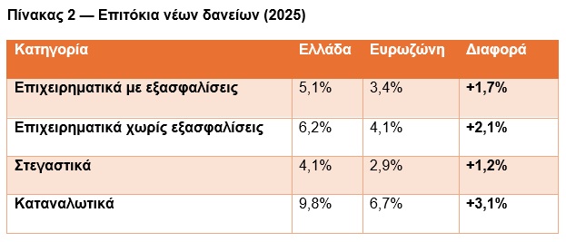 Το κλειδί για να κατανοήσει κανείς γιατί η πίστωση είναι ακριβή στην Ελλάδα είναι το loan spread — η διαφορά μεταξύ του επιτοκίου που πληρώνει ο δανειολήπτης και του κόστους χρηματοδότησης της τράπεζας. Στην Ελλάδα, τα spreads παραμένουν σταθερά υψηλότερα από τον μέσο όρο της Ευρωζώνης.