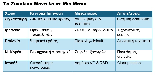 Πηγές: World Bank – World Development Indicators (GDP, ανάπτυξη, επενδύσεις), OECD – Economic Surveys και Policy Reviews, Transparency International – Corruption Perceptions Index, IDA Ireland – Επίσημη στρατηγική προσέλκυσης επενδύσεων, e-Estonia – Ψηφιακό κράτος & δημόσιες υπηρεσίες, Israel Innovation Authority – Startup ecosystem και R&D policy, Lee Kuan Yew – From Third World to First, UAE Ministry of Economy – Οικονομική πολιτική και στρατηγικές επενδύσεων