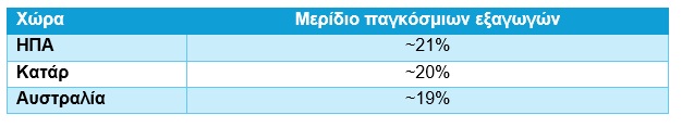 Η παγκόσμια αγορά LNG χαρακτηρίζεται επίσης από σημαντική συγκέντρωση στην πλευρά της προσφοράς. Τρεις χώρες καλύπτουν το 60% των εξαγωγών.