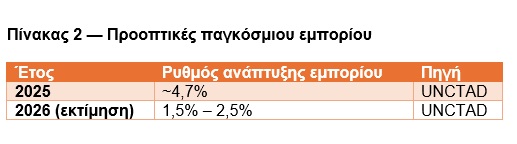 Η επιβράδυνση του παγκόσμιου εμπορίου δεν συνιστά κατάρρευση, αλλά αλλαγή υποδείγματος. Οι προβλέψεις συγκλίνουν σε χαμηλότερους ρυθμούς ανάπτυξης τα επόμενα χρόνια.