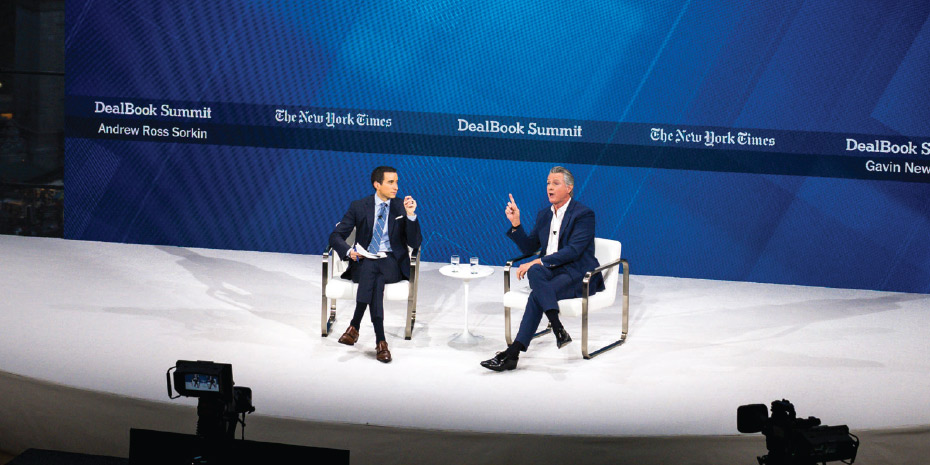 Ο κυβερνήτης Gavin Newsom της Καλιφόρνια κατά τη διάρκεια συνομιλίας με τον Andrew Ross Sorkin στη Σύνοδο DealBook στη Νέα Υόρκη, την Τετάρτη 3 Δεκεμβρίου 2025. Η οικονομική πολιτική του προέδρου Trump και η Τεχνητή Νοημοσύνη ήταν μεταξύ των κεντρικών θεμάτων της συνάντησης επιχειρηματιών και ηγετών της πολιτικής. (Karsten Moran/The New York Times)