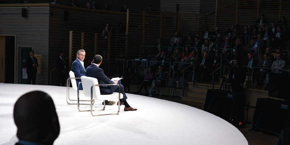 Μερικοί από το κοινό δυσανασχέτησαν όταν ο Sorkin ανέφερε ότι στον ιστότοπο του Newsom πωλούνταν επιγονατίδες για στελέχη επιχειρήσεων, πανεπιστηµιακούς και Ρεπουµπλικανούς που «κλίνουν το γόνυ» µπροστά στον Trump. «Μερικοί από εσάς µπορεί να χρειαστεί να τις αγοράσετε χονδρική», απάντησε ο Newsom στο ακροατήριο.