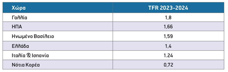 Οι διαφορές είναι σαρωτικές. Ενώ οι περισσότερες χώρες του ΟΟΣΑ θα χρειάζονταν μαζική μετανάστευση για να αποφύγουν τη συρρίκνωση, το Ισραήλ έχει καταφέρει να διατηρήσει τον πληθυσμό του. Η Γαλλία, που συχνά προβάλλεται ως ευρωπαϊκό παράδειγμα λόγω των φιλοοικογενειακών πολιτικών της, παραμένει στο 1,8 παιδιά ανά γυναίκα -κάτω από το επίπεδο αντικατάστασης. Σκανδιναβικές χώρες όπως η Σουηδία και η Νορβηγία, με γενναιόδωρα επιδόματα και άδειες, δεν ξεπερνούν το 1,7. Η Γερμανία, που για χρόνια βρισκόταν στο 1,3, με πολύ κόπο ανέβηκε στο 1,6. Η Ελλάδα, παρά κάποιες προσπάθειες επιδότησης γεννήσεων, παραμένει στο 1,3 και με έντονο πρόβλημα γήρανσης.