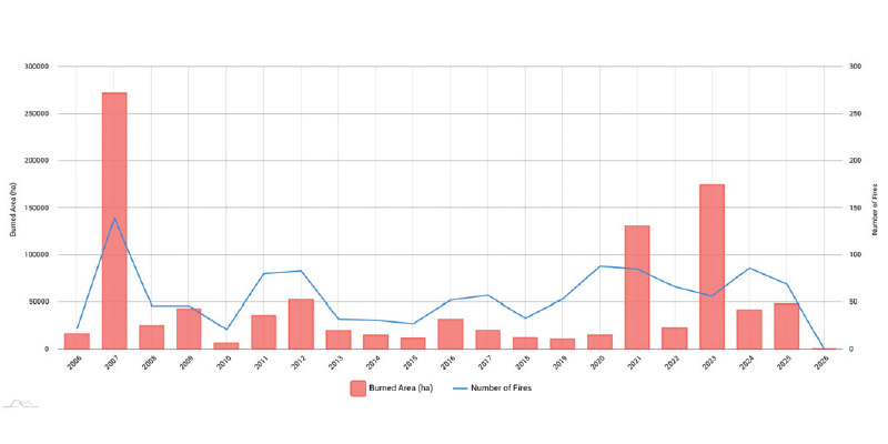 Γράφημα: Καμένες εκτάσεις και αριθμός πυρκαγιών ανά έτος στην Ελλάδα την περίοδο 2006-2025. Δεδομένα από το Ευρωπαϊκό Σύστημα Πληροφόρησης για τις Δασικές Πυρκαγιές.