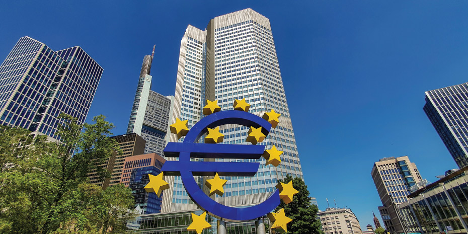 Το σύμβολο του ευρώ μπροστά από τον ουρανοξύστη που στεγάζει την Ευρωπαϊκή Κεντρική Τράπεζα, ο οποίος βρίσκεται σε συνοικία της Φρανκφούρτης στη Γερμανία