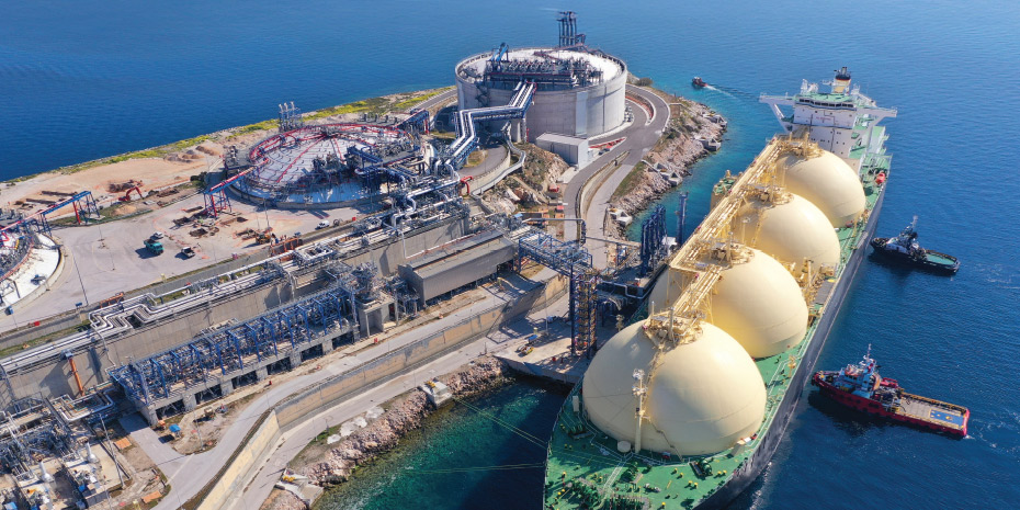 Εναέρια φωτογραφία δεξαμενόπλοιου LNG στο νησί της Ρεβυθούσας. «Η αξιοποίηση του φυσικού μας πλούτου, με τις επερχόμενες γεωτρήσεις της ExxonMobil και της Chevron είναι συμπληρωματική της πολιτικής μας για διαφοροποίηση των πηγών ενέργειας», τονίζει ο κ. Παπασταύρου
