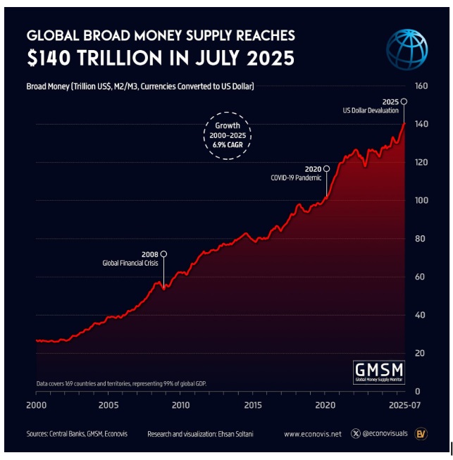 Η αύξηση ήταν 10 τρισ. δολάρια το 2025 και 40 τρισ. δολάρια από το COVID. Η μέση ετήσια αύξηση της προσφοράς χρήματος από το 2000 ανέρχεται σε 7% περίπου.