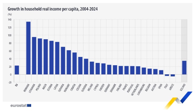 To πραγματικό κατά κεφαλήν εισόδημα των νοικοκυριών στην Ευρωπαϊκή Ένωση (ΕΕ) αυξήθηκε κατά 22% μεταξύ 2004 και 2024, σύμφωνα με τη χθεσινή ανακοίνωση της Eurostat.Η μεγαλύτερη αύξηση της τάξης του 134% καταγράφηκε στη Ρουμανία και ακολούθησαν η Λιθουανία με 95%, η Πολωνία με 91% και η Μάλτα με 90%. Οι μοναδικές χώρες που είδαν το πραγματικό εισόδημα των νοικοκυριών τους να μειώνεται τα τελευταία 20 χρόνια ήταν η Ελλάδα και η Ιταλία με -5% και -4% αντίστοιχα.